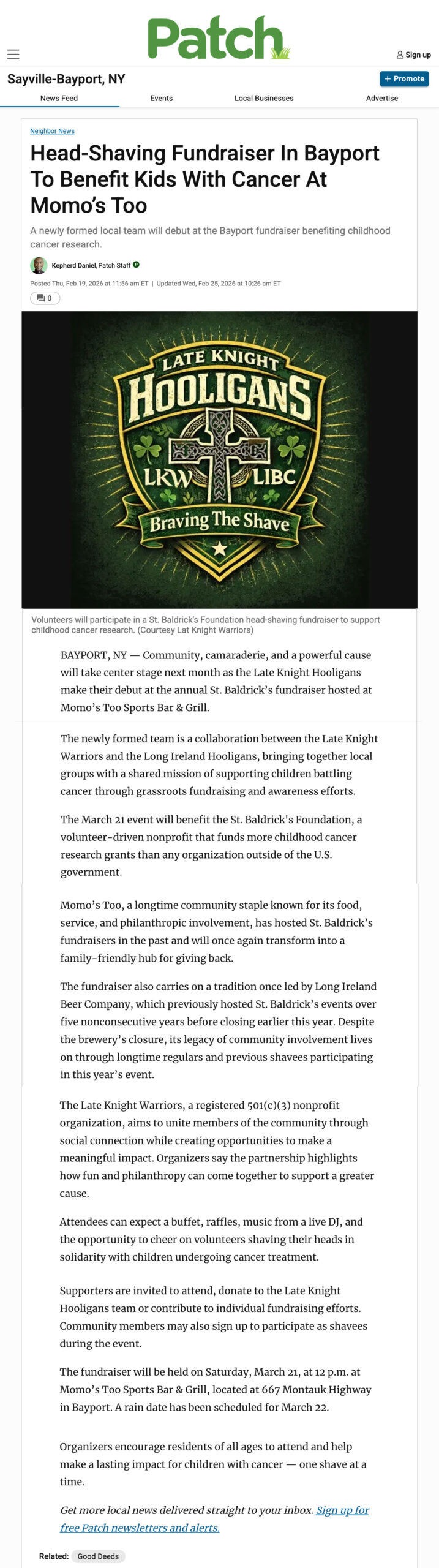 BAYPORT, NY — Community, camaraderie, and a powerful cause will take center stage next month as the Late Knight Hooligans make their debut at the annual St. Baldrick’s fundraiser hosted at Momo’s Too Sports Bar & Grill.