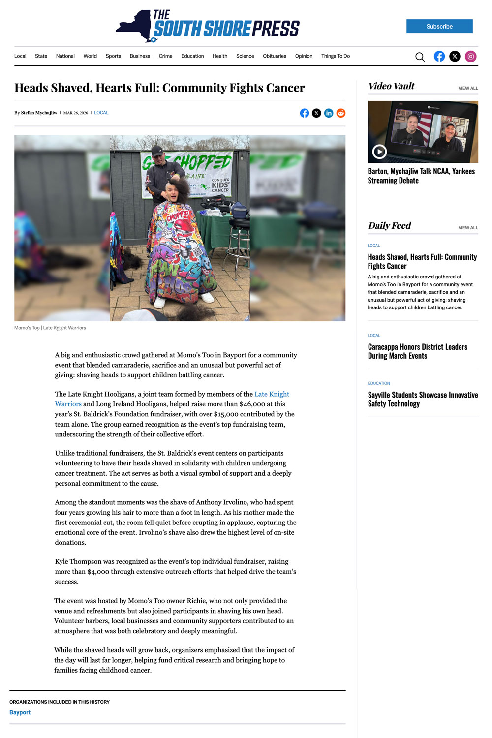 A big and enthusiastic crowd gathered at Momo’s Too in Bayport for a community event that blended camaraderie, sacrifice and an unusual but powerful act of giving: shaving heads to support children battling cancer.